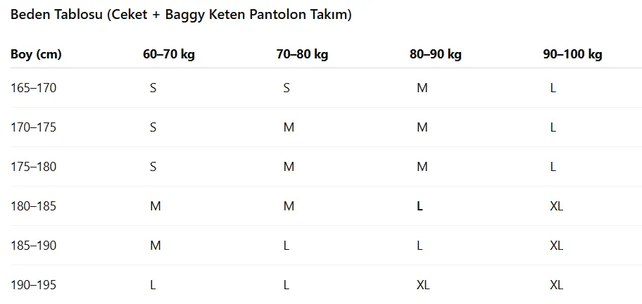 Mevsimlik keten ceket ve baggy kalıp keten pantolon takımı, keten dokusunun en şık ve en konforlu halini bir araya getiriyor. Hafif yapısı ve modern kesimiyle hem günlük kullanımda hem de özel günlerde güçlü bir stil sunar.